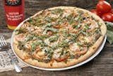 Fresh baby wild arugula dressed with white balsamic vinegar, olive oil, salt and pepper, a light spread of our savory tomato sauce, mozzarella, goat cheese,vine-ripened tomatoes and pine nuts.